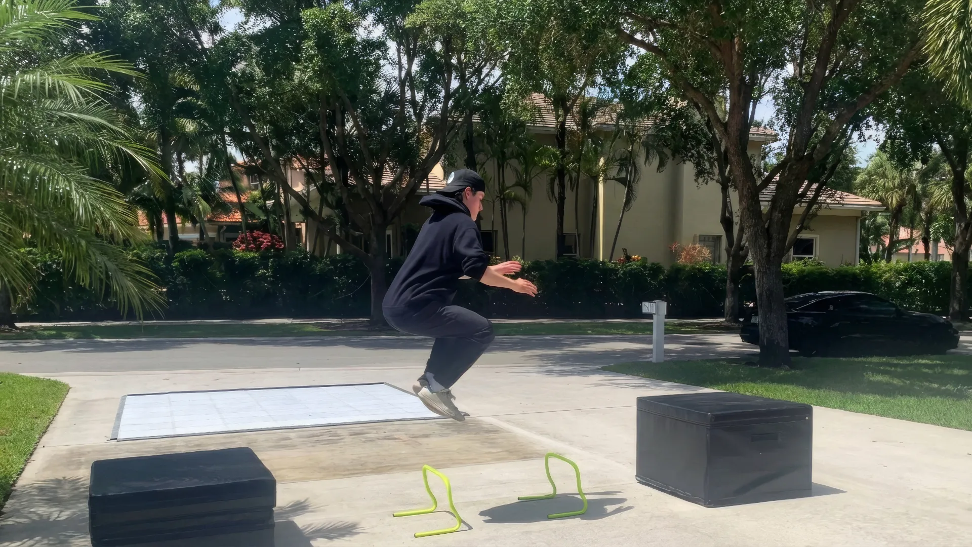 - During the hop, drive your trail knee and lead arm upward to help generate vertical power